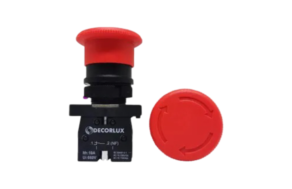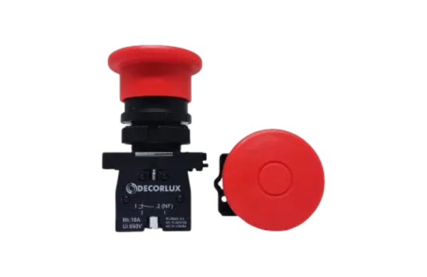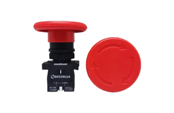• Botão cogumelo, trava e puxa para destravar, plástico, 1NF, Ø40mm